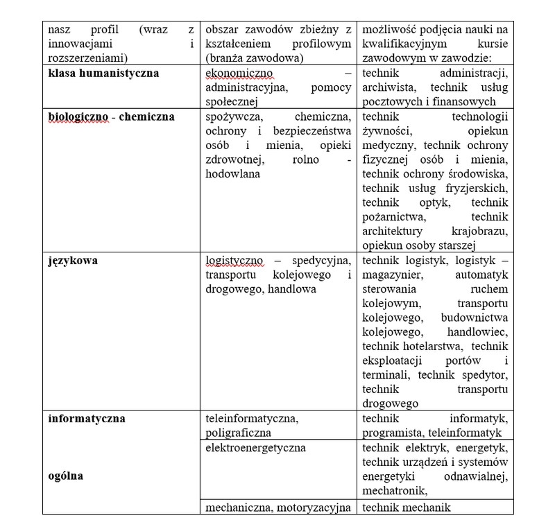 Zdobędziesz u nas wykształcenie średnie (i świadectwo dojrzałości), a dzięki współpracy z instytucją kształcącą w zawodach poszukiwanych na rynku pracy, zdobędziesz zawód (dyplom w zawodzie). Innowacyjne metody nauczania oraz innowacje w programie nauczania danego przedmiotu gwarantują przygotowanie do realizacji wymarzonej ścieżki zawodowej.