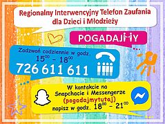 Telefon Zaufania dla Dzieci i Młodzieży. 20 kwietnia 2020 r. Samorząd Województwa Łódzkiego uruchomił Regionalny Interwencyjny Telefon Zaufania dla Dzieci i Młodzieży (RITZ). Infolinia stanowi wsparcie i pomoc w sytuacjach kryzysowych, które narastają wśród wielu młodych osób w okresie pandemii. Telefon (726 611 611) i czat (prowadzony w aplikacji Snapchat i Messenger - pogadajmytutaj) obsługiwane są przez 7 specjalistów pedagogów, psychologów, interwentów kryzysowych i terapeutów, posiadających doświadczenie w pracy z dziećmi i młodzieżą. Z Regionalnego Interwencyjnego Telefonu Zaufania mogą korzystać dzieci i młodzież z województwa łódzkiego oraz ich rodzice i opiekunowie. Interwencje prowadzone są w takich sytuacjach jak: obniżenie nastroju, stres, kryzysy emocjonalne, nagromadzenie negatywnych myśli czy konflikty, a także związanych bezpośrednio z zagrożeniem zdrowia lub życia: myśli i plany samobójcze, zachowania autoagresywne, autodestrukcyjne, ryzykowne (związane z nadużywaniem alkoholu, narkotyków i innych substancji psychoaktywnych) oraz wystąpienie przemocy w rodzinie. To, co wyróżnia infolinię na tle podobnych form pomocy, to przede wszystkim jej dostępność 7 dni w tygodniu (telefon czynny w godzinach 15.00 18.00, czat w godzinach 18.00 21.00) oraz możliwość kontaktu opartego na pisaniu wiadomości (Snapchat i Messenger). Do końca 2020 roku do Regionalnego Interwencyjnego Telefonu Zaufania dla Dzieci i Młodzieży po pomoc zgłosiło się 565 młodych mieszkańców regionu. Znaczna część konsultacji została przeprowadzona przez media społecznościowe (snapchat i messenger). Z tej formy pomocy skorzystało 289 osób. Porad telefonicznych udzielono 276 osobom.