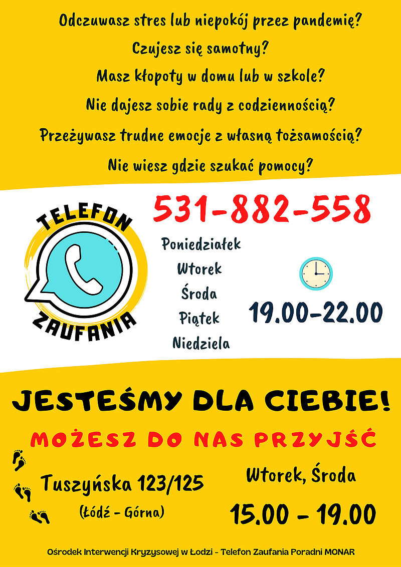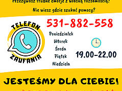 Telefon Zaufania działa w poniedziałki, wtorki, środy, piątki i niedziele w godz. 19:00 - 22:00